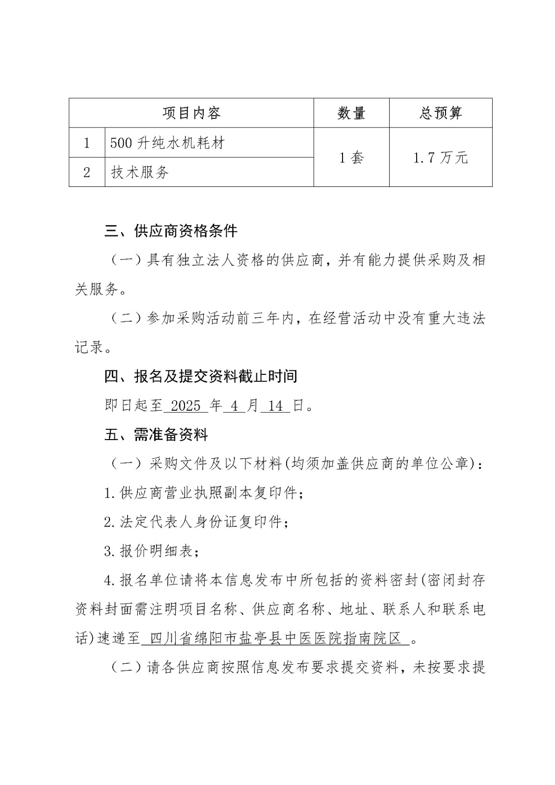 盐亭县中医医院500升纯水机耗材采购项目信息公告