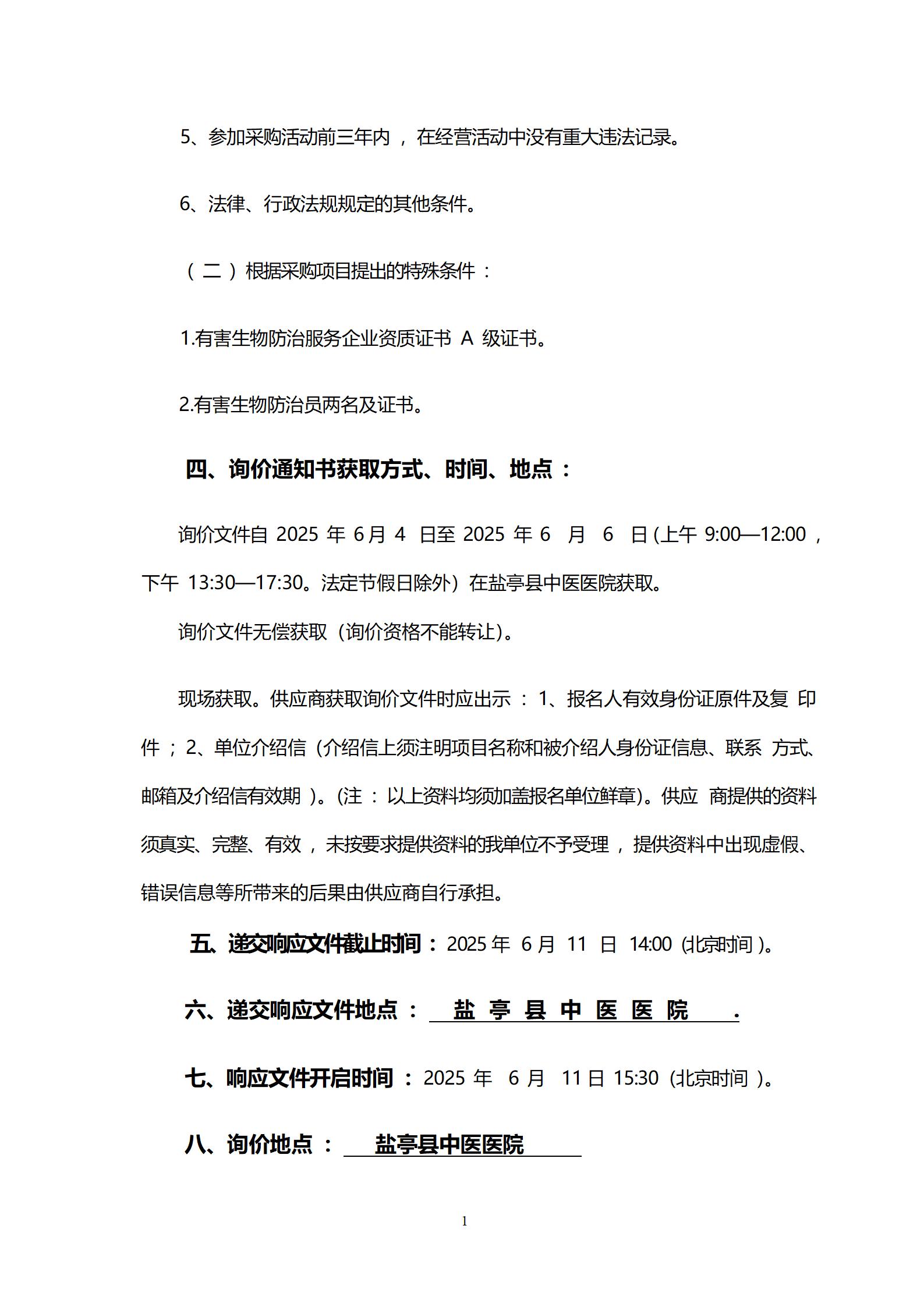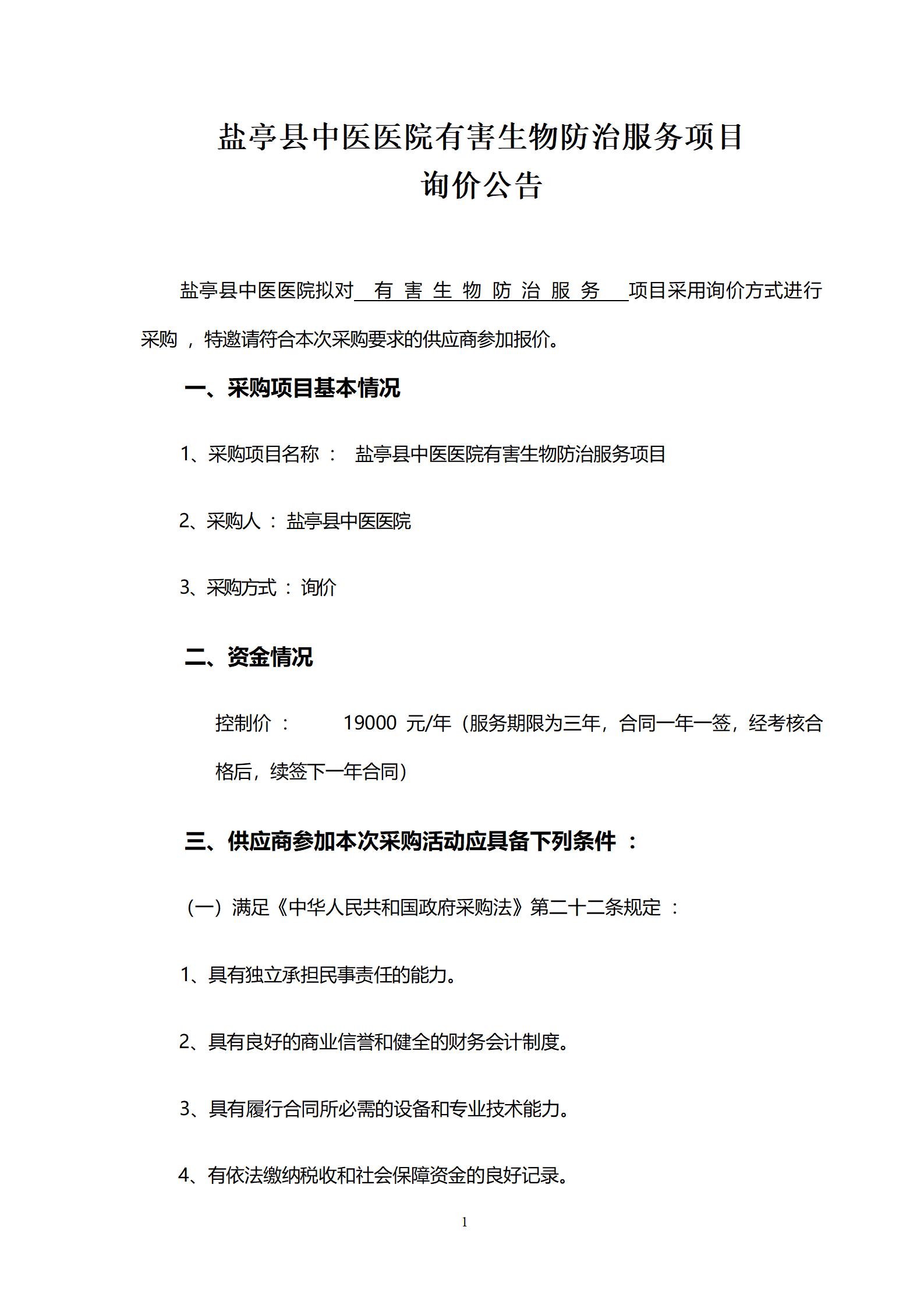 盐亭县中医医院有害生物防治服务项目询价公告