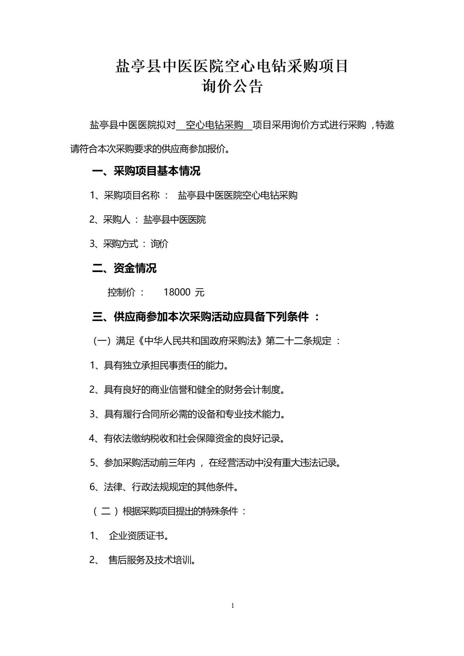 盐亭县中医医院空心电钻采购项目询价公告
