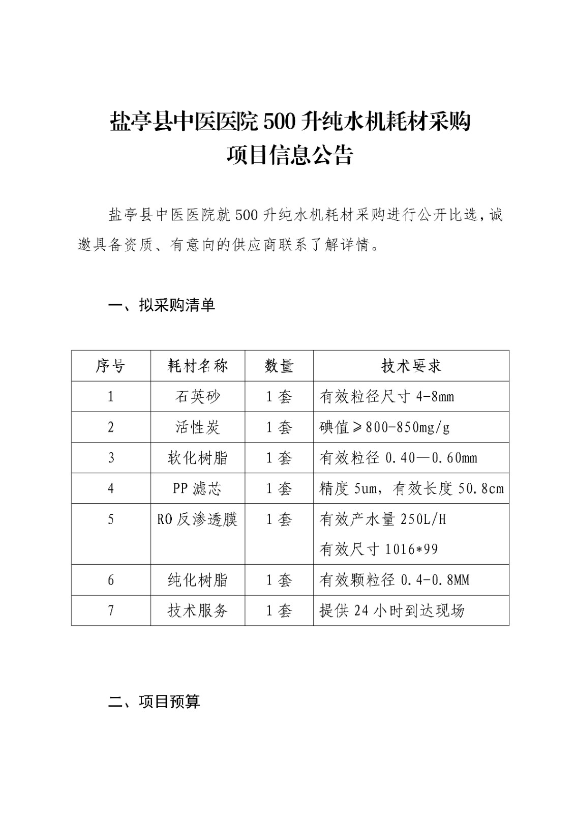 盐亭县中医医院500升纯水机耗材采购项目信息公告